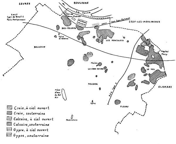 Nous trouvons d’abord la craie affleurant sur les bords de la Seine et transformée en blanc de Meudon ou d’Espagne ou en chaux, puis les marnes et calcaires de Meudon n’ayant pas fait l’objet d’utilisation industrielle.