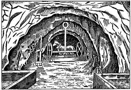 A partir de 1870, la roue de carrière est remplacée par le manège à cheval d’une capacité de levage de 5 à 10 tonnes. Les montants du treuil sont soit des massifs de maçonnerie, soit des charpentes en bois. La corde d’abord en chanvre fut ensuite remplacée par un filin d’acier. Les ouvriers descendent dans la carrière au moyen d’une échelle de perroquet, barre de bois munie d’échelons pendant dans le puits. A Meudon, les carrières ont été exploitées par la méthode dite par hagues et bourrages. Les carriers ne retirent que le banc recherché. Les bancs non utilisables, nécessairement dégagés pour faciliter le travail, servent à remblayer les vides créés. Ces remblais ou bourrages sont maintenus par de petits murs en pierres sèches, les hagues. De part en part, des piliers à bras, formés de blocs bruts superposés, soutiennent le ciel de carrière. Les vides restants ne sont formés que par les ateliers d’extraction et les galeries de circulation en direction du puits. Ces galeries permettant le transport des blocs sur de petits charriots ont environ 2 mètres de hauteur pour une largeur de 2 à 3 mètres. Par contre l’atelier à une hauteur de 1 à 1,50 mètres.